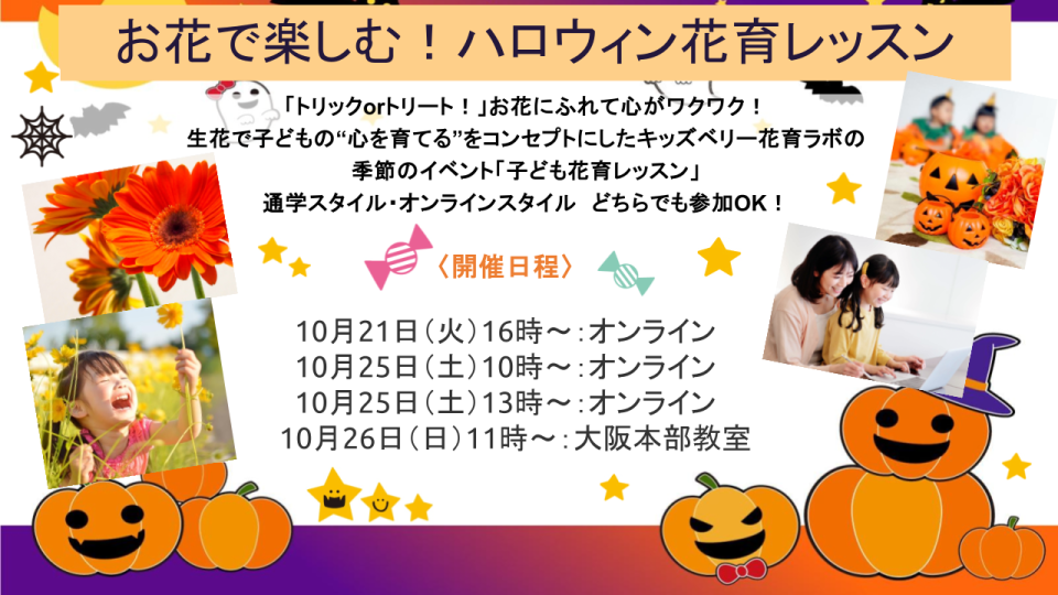 🎃ハロウィン♪季節イベント「花育レッスン」開催!🍬 キッズベリー花育ラボから、ハロウィン気分を楽しみながらお花とふれあえる特別イベント「子ども花育レッスン」のご案内です。 オレンジや紫、黒……
