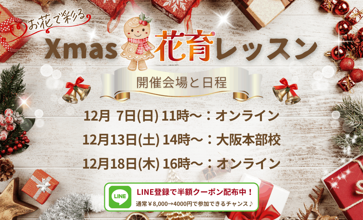 実施方法 オンライン、認定教室 <東京本部校、大阪本部校、まほろば子ども花育教室(東京都昭島市)、花華香房(神奈川県横浜市)> 開催一覧 [オンラインレッスン] 12月4日(日)10:00~11:00 12……